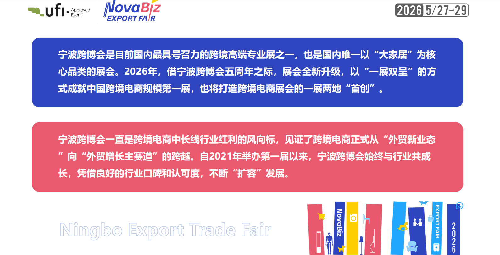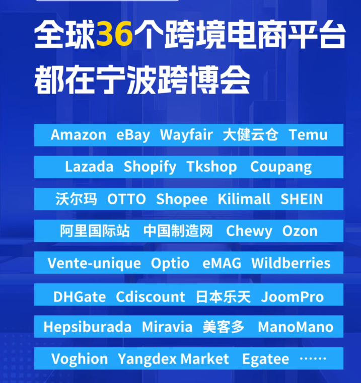 宁波跨博会是目前国内最具号召力的跨境高端专业展之一,也是国内唯一以“大家居”为核心品类的展会。2026年,借宁波跨博会五周年之际,展会全新升级,以“一展双呈”的方式成就中国跨境电商第一展,也将打造跨境电商展会的一展两地“首创”。 宁波跨博会一直是跨境电商中长线行业红利的风向标,见证了跨境电商正式从“外贸新业态”向“外贸增长主赛道”的跨越。自2021年举办第一届以来,宁波跨博会始终与行业共成长,凭借良好的行业口碑和认可度,不断“扩容”发展。 >36大跨境电商平台,覆盖欧美、非洲、中东、东南亚、俄罗斯等全球市场,为企业提供“一站式平台对接+全维度政策支持”; >190+金融、选品、代运营、营销、园区、人才、财税、合规等跨境电商各环节服务机构参展,护航企业稳健出海。