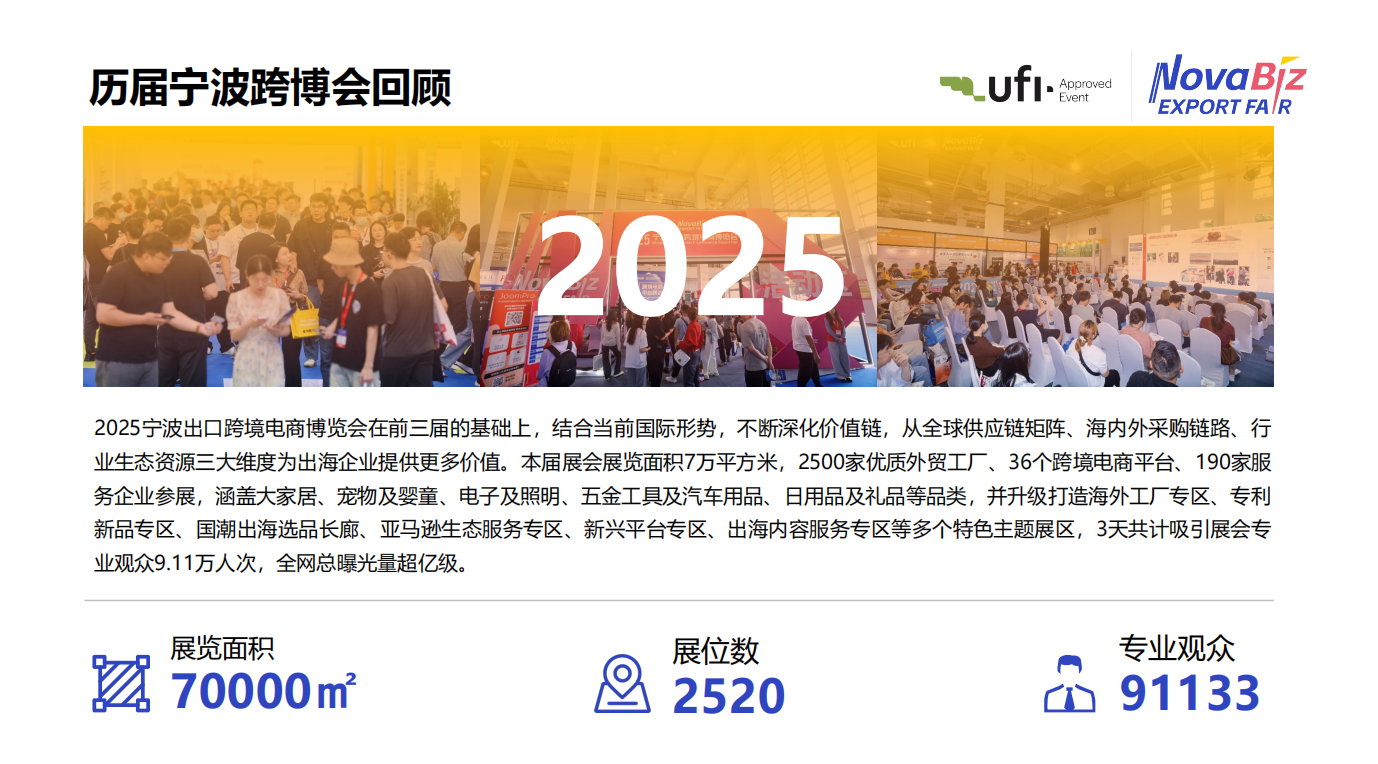 2026宁波出口跨境电商博览会--打通跨境壁垒,助力品牌出海!Ningbo Cross-border E-commerce Export Fair展会时间:2026年5月27-29日 (为期3天)举办地点:宁波国际会展中心1-8号馆 + 余姚中塑国际会展中心 2-3-4号馆展会规模:90,000平方米