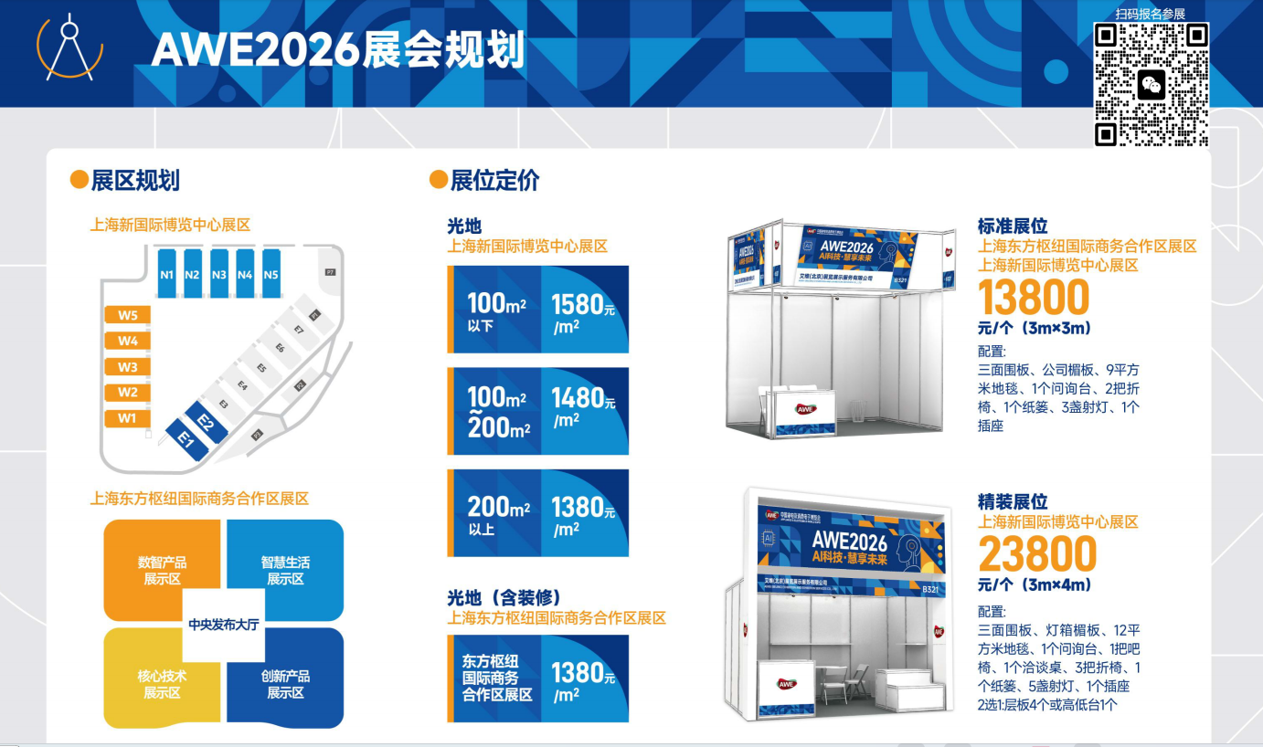 AWE作为亚洲规模最大、全球三甲的国际家电及消费电子展览会,汇聚了全球最顶级的产品体验场景、贸易商洽机会、技术战略交流环境、品牌传播声量、多维度用户人群、跨界交流平台、资本市场关注,提升产业社会关注度和影响力,为参展品牌和合作伙伴全面赋能。 中文名:中国家电及消费电子博览会 英文名 :Appliance&electronics World Expo (AWE) 主题:AI科技、慧享未来 展示时间 :2026年-3月12-15日 主办单位:中国家用电器协会 承办单位:北京盛世协联会展服务有限公司 展示地点:上海新国际博览中心 W1-W5 N1-N5 E1-E2共14个展馆 展会规模:预计 160000 万平米 参展品牌:1200+家 参观人次:预计 400000+ 智能产品:300000+ 参观参展请致电:张丽 135 1211 9684 展位预定:https://www.shzhanhui.cn/awe.html ![]() AWE2026将以“AI科技、慧享未来”为主题,首次启用“一展双区”的新模式,于2026年3月12-15日在上海新国际博览中心与上海东方枢纽国际商务合作区日上综合体两地同步举行,展览面积预计将突破17万平方米,参展品牌预计超1200家,汇聚全球最前沿的智能科技成果与未来生活场景解决方案。 AWE2026增设“消费电子先进科技展区”,形成“一展双区”新格局 为贯彻科技创新和扩大开放的国家战略,AWE2026在上海市有关部门的建议、指导和大力支持下正式启动。AWE2026将迎来历史性升级——在上海新国际博览中心(新国博)继续办展的基础上,首次在上海东方枢纽国际商务合作区设立“消费电子先进科技展区”,形成“一展双区”新格局,合计展出面积将达到17万平米,参观人数预计突破20万人。 AWE2026的两个展区将在定位和功能上实现协同联动。新国博展区展期4天,为2026 年3月12-15日,最后一天为消费者日;该展区将继续汇聚千余家全球家电与消费电子产业链上下游的头部品牌与创新力量,以14万平米的展览面积展示智慧生活解决方案和创新产品,以及全屋智能、数字娱乐、运动健康、绿色能源、智慧出行、智慧办公、智慧城市等领域的创新应用,呈现以人和场景为核心的家电及消费电子产业发展全貌。 上海东方枢纽国际商务合作区展区定位“消费电子先进科技展区”,展期3天,为2026年3月12-14日,不设消费者日。展区将使用上海东方枢纽国际商务合作区日上综合体3层,展览面积3万平米。展区重点聚焦芯片及算力技术、人工智能、新一代信息技术、新型显示、机器人、无人机、新能源汽车及智慧家庭等前沿领域,设置核心技术突破、创新产品落地、数智终端升级与智慧生活场景四大主题展区,呈现AI时代下消费电子产业的新质生产力发展成果。 ![]() AWE - Path of Transformation and Upgrading AWE - 转型升级之路 2014——参展商:500+ 展馆面积:6W 观众:8.2W 正式更名AWE”从行业内展会逐步向公众端延伸 2015——参展商:550+ 展馆面积:7W 观众:11W 2016——参展商:600+ 展馆面积:10W 观众:18W 互联网一你的家从传统家电逐步向互联网领域延伟 2017——参展商:700+ 展馆面积:11W 观众:22W 2018——参展商:800+ 展馆面积:12.5W 观众:29.2W 智慧生活全球平台从家电及消费电子展逐步向智慧生活全球平台延展 2019——参展商:900+ 展馆面积:13.5W 观众:35W 2020——因疫情延期至2021年 2021——参展商:1000+ 展示面积:15W 观众:35W 2024——参展商:1200+ 展示面积:16W 观众:15W 2025——参展商:1200+ 展示面积:14W 观众:19.2W AI科技·慧享生活 2026——参展商:1200+ 展示面积:17W 观众:20W(预计) ![]() AWE2026展馆规划 ■W1 智能家电馆 ■W2 智能家电馆 ■W3 消费电子、智能科技馆 ■W4 消费电子、智能科技馆 ■W5 消费电子、智能科技馆 ■N1 智能厨电馆、 ■N2 智能厨电馆 ■N3 智能厨卫馆、厨房小家电馆 ■N4 国际品牌馆 ■N5 海尔智家馆 ■E1 清洁电器、生活电器馆 ■E2 家电产业链 2026AWE价格体系 光地 100m2以下 1580元/ m2 100~200m2 1480元/ m2 200m2以上 1380元/ m2 标准展位可选 普通展位:13800元/个(3mX3m) 配置:三面围板、公司楣板、9 平方米地毯、1个问讯台,2把折椅,1个纸篓、3盏射灯、1个插座 精装展位:23800元/个(3mX4m) 配置:三面围板、灯箱楣板、12 平方米地毯、1个问讯台,1把吧椅,1个洽谈桌,3把折椅,1个纸篓、5盏射灯、1个插座、2选1:层板4个或者高低台1个