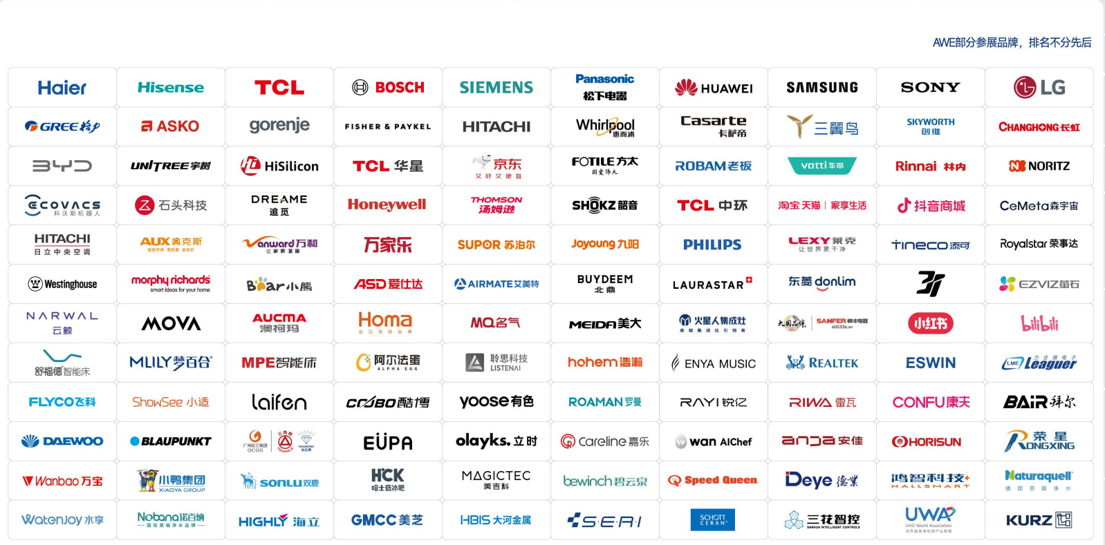 部分参展商: 白电(冰洗空):海尔、海信、海立、美的、小鸭、惠而浦、西门子、TCL、松下、AEG、博世、格兰仕、美菱、金鱼、格力、日立、万宝、双鹿、扬子、澳柯玛、大宇、奥克斯、新飞、荣事达等…… 黑电(消费电子):三星、LG、夏普、飞利浦、康佳、京东、华为、索尼、创维、长虹、intel、大疆、天猫、360、小米、乐视等…… 智能家居(物联网黑科技):南京物联、特斯拉、机智云、云智易、妙联、拓邦、司南物联、艾米、小象、智城云、涂鸦、爱屋安、家畅、鸿雁、中科智康、享睡、庆科、金指码、达峰、瑞鑫、普思英察、紫光物联、银河风云、智慧云谷、艾拉物联、德澜、智车优行、硬蛋等…… 厨卫电器:AO史密斯、方太、老板、美大、欧琳、阿里斯顿、帅康、四季沐歌、德意、樱花、奥田、力诺瑞特、华帝、万和、万家乐、云米、星星便洁宝、凯芙隆、复荣、红日、名气、荣星、太阳雨、乐瑞等…… 小家电(生活电器):苏泊尔、九阳、爱仕达、小熊、虎牌、伊莱特、三禾、帝而、艾美特、卓力、月立、荣泰、泰昌、超人、新功、罗曼、哈尔斯、沃尔、爱丽思、兴龙辉、奔腾、先锋、雷瓦、飞科、索利斯、天际、海氏等….. 家用清洁机器人:irobot、小狗、科沃斯、福玛特、视贝、嘉世达、莱克、凯驰、石头科技、TEK、亿倍、洒哇地咔、地贝、蓝宝、东亿等…… 零配件(家电配件):美芝、东芝、钱江、加西贝拉、黄石东贝、天银、扎努西、国冶星、库尔兹、恩布拉科、ABB、库卡、公牛等….. 环境电器(空气净化器、新风机):3M、亚都、远大、大然新风、黑森林、LIFAair、Blueair、奥郎格、CADO、森乐、美国西屋、滤巨人、普诺星、利法纳、唯科、Careair、Fasflo、裕盛环宇、栢业、AirProce、三个爸爸、汉王蓝天、352air、爱优特等…… (家用净水器)奔泰、泉来、浩泽、太阳雨、安吉尔、美国怡口、3M、沁园、开能、艾波特、伊美特、立升、滨特尔、金利源、澳兰斯、沁尔康、威博、等…… (其他类别)空净过滤网、净水泵阀、咖啡机、个人护理电器、温控器、传感器、电热水龙头、垃圾处理器、家电工业设计、国内外组团、娱乐电器、制冷配件、家电包装等…… AWE组委会联系方式: 中国家用电器协会展览部 电话(TEL): 135 1211 9684 |