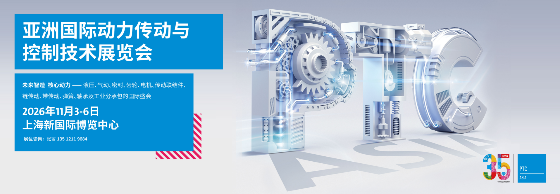 2026上海PTC展 | 亚洲国际动力传动与控制技术展览会PTC ASIA 机械和电气传动、流体传动与控制、机械零部件、 弹簧、轴承的国际盛会 液压、气动、密封、齿轮、电机、链传动、带传动、弹簧、轴承、及工业分承包的国际盛会 时间:2026年11月3-6日 地点:上海新国际博览中心 主办方: 中国液压气动密封件工业协会 中国机械通用零部件工业协会 汉诺威米兰展览(上海)有限公司 PTC ASIA 2026 展位招商,现已全面启动! 展位咨询热线:张丽 女士 135 1211 9684 ------------------------------------------------ 同期展会: 2026第26届亚洲国际物流技术与运输系统展览会(CeMAT ASIA) ——物料搬运、自动化技术、运输系统、物流的国际盛会 时间:2026年11月3-6日 地点:上海新国际博览中心(上海市浦东新区龙阳路2345号) 展会面积:超展商数目:超800家展商80, 000平方米 主办单位:中国物流与采购联合会、中国机械工程学会、德国汉诺威展览公司、汉诺威米兰展览(上海)有限公司 ![]() 2026亚洲动力传动展与物流展、压缩机展、高空作业平台展、重型机械展、冷链展、特殊钢展、电商包装展、日本零部件展、零部件及分承包特别展示区等多个行业展会联合打造汉诺威上海工业联展,汇聚工业制造上下游各个领域的知名企业,通过对产品类别的细分与补充,让观众总能找到自己想看的内容。 作为动力传动行业亚洲第一、世界第二的国际性专业展会,由中国液压气动密封件工业协会、中国机械通用零部件协会、汉诺威米兰展览(上海)有限公司共同主办的2026亚洲国际动力传动及控制技术展览会(PTC Asia)于2026年11月3-6日在上海新国际博览中心举办。 ![]() 展会以“ 驱动未来” 为口号,吸引了德国、意大利、土耳其、美国、西班牙、葡萄牙、日本、韩国、匈牙利、罗马尼亚等多个国家和地区的近1,800家企业参展,展示规模达100,000平方米。展会涵盖液压、气动、密封、齿轮、电机、传动联结件、链传动、带传动、弹簧和轴承十大主题展区。为期4天的展会共吸引142,975名专业观众,150个买家参观团到场参观,88%的观众涉及采购及相关。另外主办方还组织了13场专业论坛和200场商务配对活动,以行业--产品、技术与解决方案助力实践“ 中国制造2026”。 ![]() 自1991年首次举办以来,展会从每两年一届发展至每年一届,展出面积、展品内容不断扩大,专业观众成倍增加,极大地推动了动力传动与控制技术市场的国际交流及贸易市场的发展。该展览会不仅为众多国际品牌进入中国及亚洲市场提供了机遇,更为中国市场带来了全球采购的绝佳平台。 ![]() EXHIBITS PROFILE / 展品范围 1, 流体动力:液压泵、马达、驱动装置和附件、液压阀、液压缸、液压系统及成套设备、气动阀、气缸和气动管、流体压力软、硬管和管接头、传感和检测系统、密封技术 2, 机械传动、零部件及制造设备:齿轮传动、链传动、带传动、传动联结件、弹簧、冶金制品、各类机械装备及检测仪器 3, 轴承:轴承及其轴承零部件、轴承生产及加工设备、相关设备与附件 4, 直线运动系统:直线导轨、直线运动驱动元件/系统、直线运动系统、电动机械致动装置、复式运动系统 5, 电气传动:工业电机、伺服电机、变频器、驱动器、电磁装备